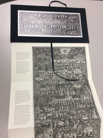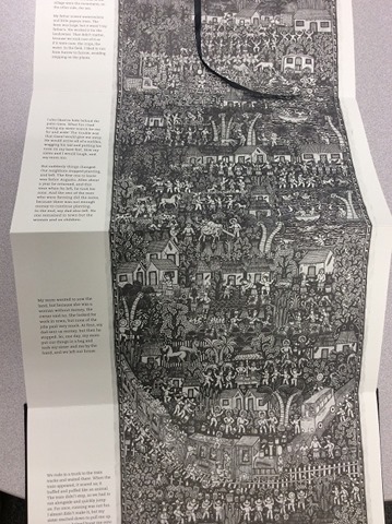 Even as I gush about the writing, I can’t say enough about the art. Done in a single pane that continues through the entire vertical book, it shows the village, the train that allows their escape, and finally LA. The art has an ancient feel to it, filled with tiny details, many people, plants, houses, and more. It’s a tribute to the history of Mexico, the thousands of people who cross the border, and the beauty of their courage.