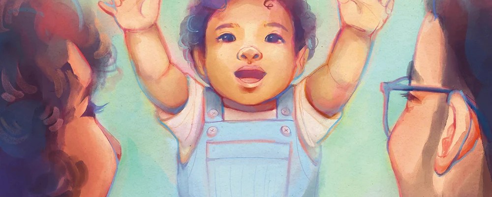 A mother, father and their daughter come home from a wintry walk with their dog. They curl up together in bed to read a book about having a new baby. On the opposite page, the growth of the baby begins, starting with one cell that divides getting bigger with each turn of the page. Their busy days take them to the doctor for an ultrasound, assembling the crib, and lots of quality time just spent with one another. As the seasons change, so does the size of the mother’s tummy. Growing to match, the images of the baby in the womb get larger and become actual size. Crowded onto the page, the baby finally arrives and enters the light and wonder of their new family.